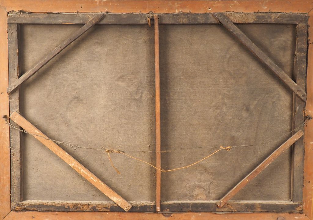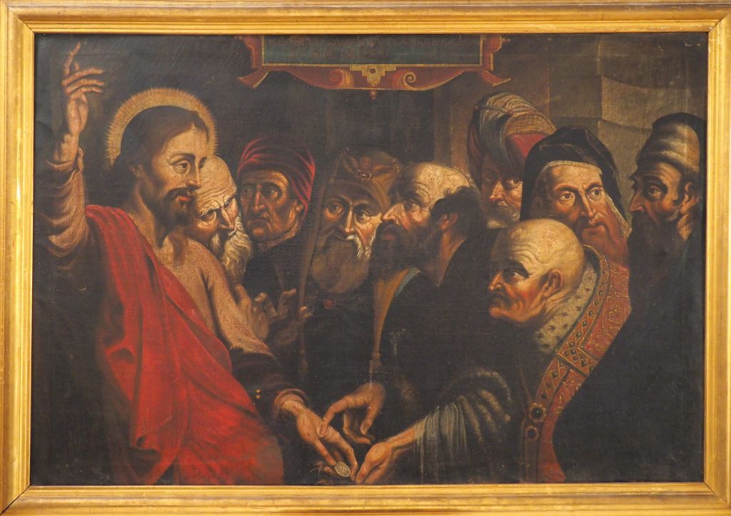 Ecole XVIIème d'après RUBENS. "Le denier de César". Grande Huile sur toile. Dim. 83 x 124 cm. (Petits accidents).