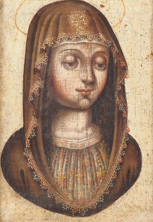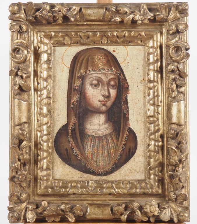 Ecole XVIIème. "Sainte femme" Huile sur toile Dim. 28,5 x 23 cm dans un cadre XVIIIème en bois et stuc doré à décor de fleurs