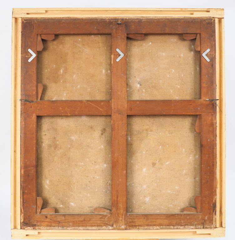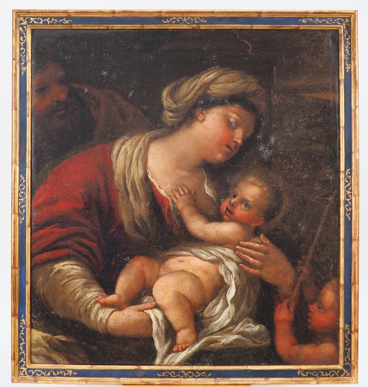 Ecole XVIIème. "Vierge à l'enfant et St Jean Baptiste". Huile sur toile Dim. 84 x 78 cm (restaurée et réentoilée)