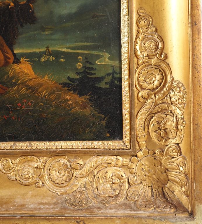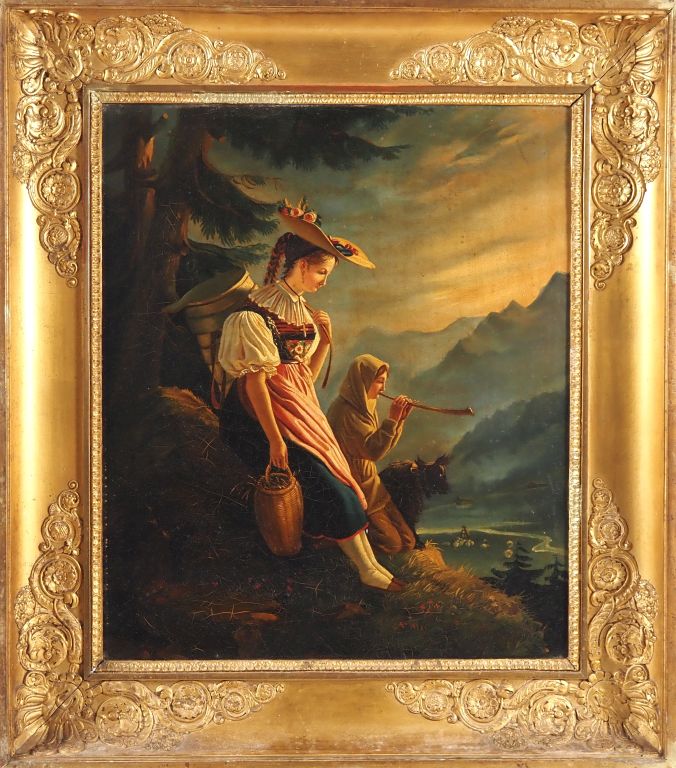 Gabriel Ludwig Lory ? Maison Alphonse Giroux. "Pastorale dans un paysage montagneux". Huile sur toile (toile d'origine d'Alphonse Giroux). Dim. 54 x 46 cm. (Restauration)