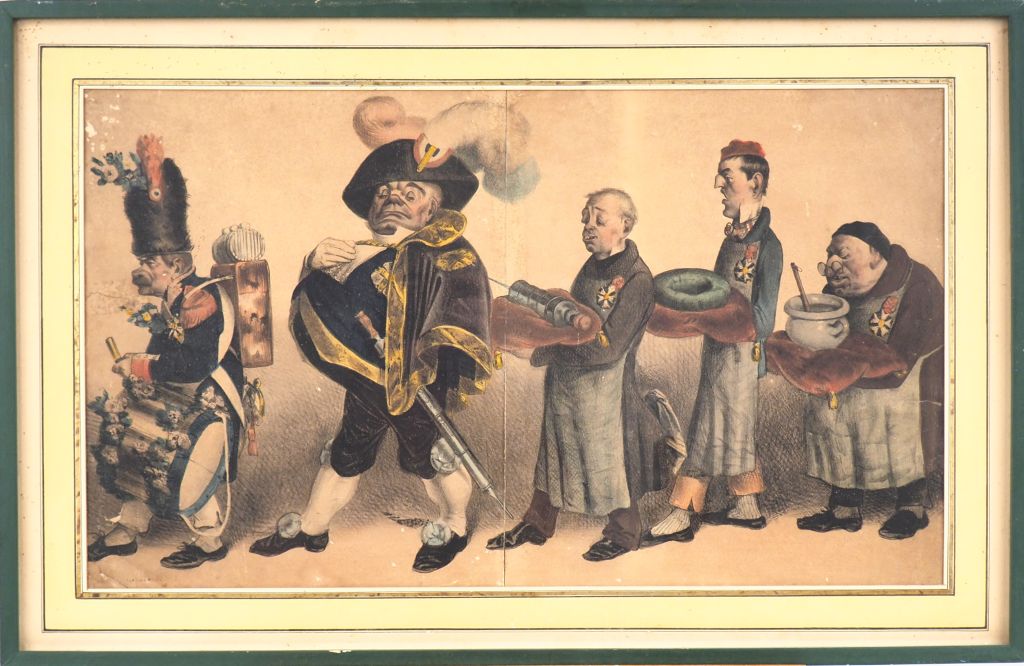 Gravure en couleurs "Caricature du médecin". Dim. 29 x 49,5 cm