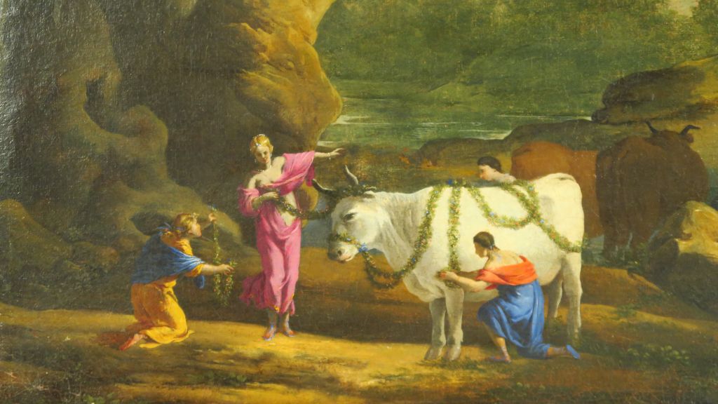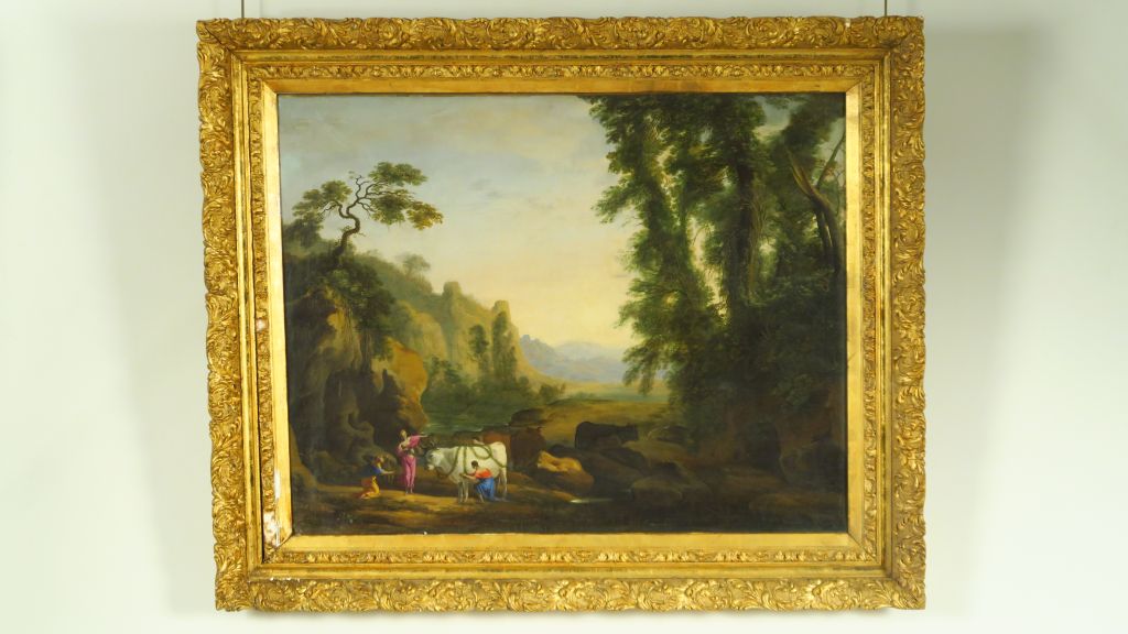 Herman Van SWANEVELT (Attribué à) (1600 - 1655) "Zeus paré par Europe" Huile sur toile. Dim. 75 x 96 cm Restaurations anciennes Cadre XIXème.
