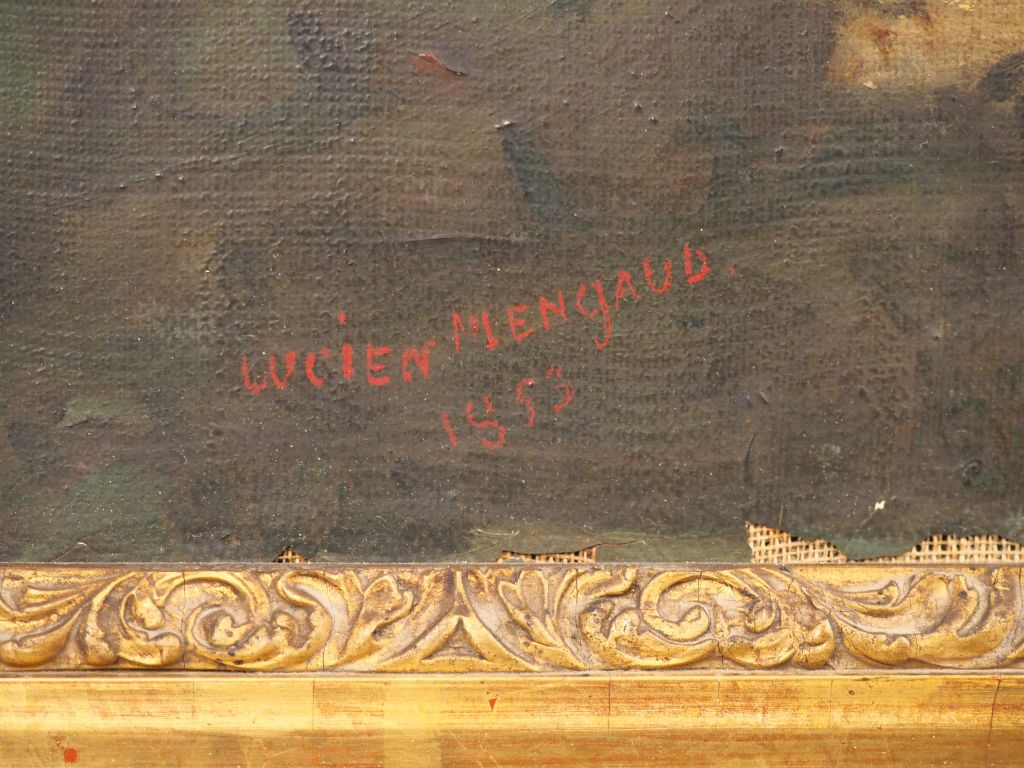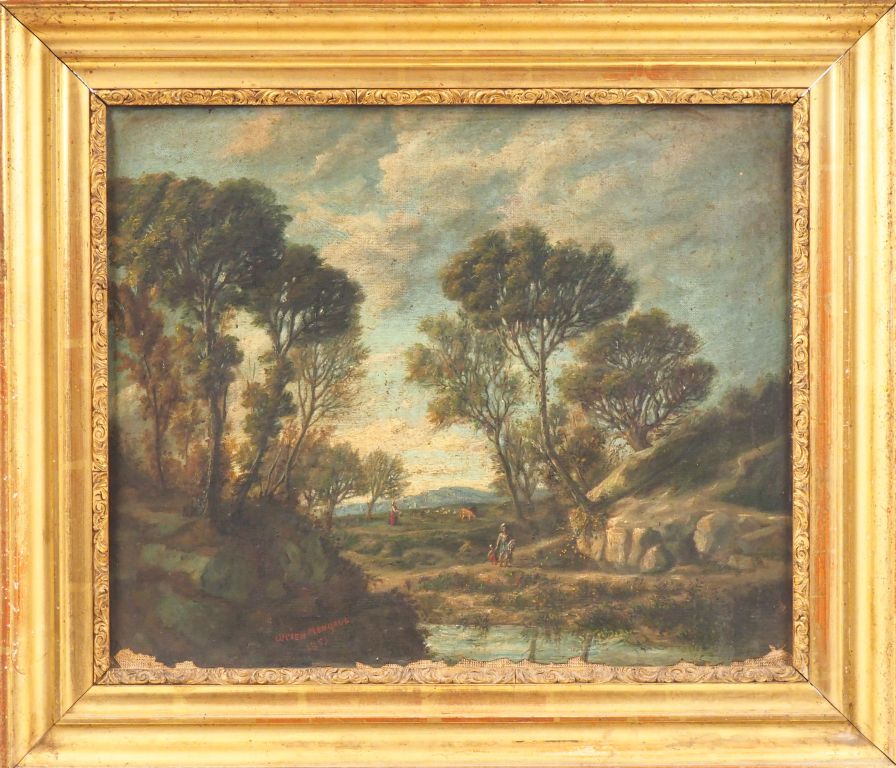Lucien MENGAUD. "Bergères et leur troupeau". Huile sur toile, signée et datée 1853. Dim. 38 x 46 cm. (Sauts de peintures).