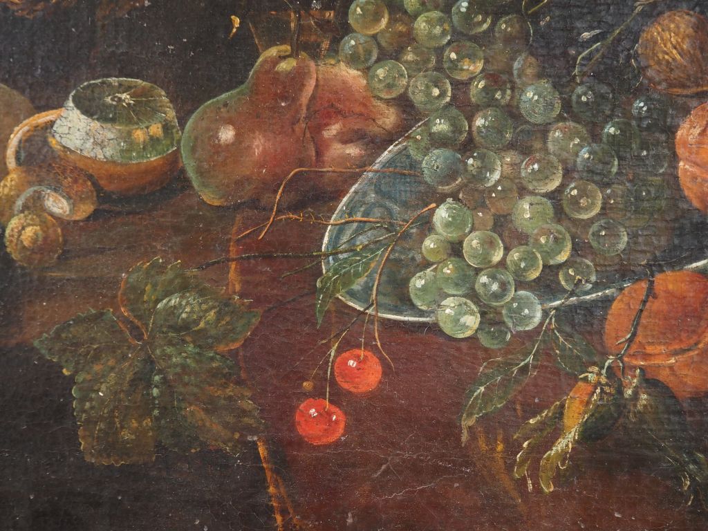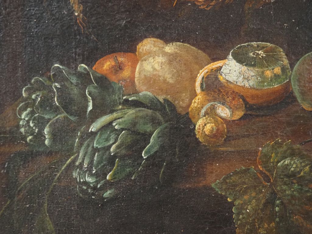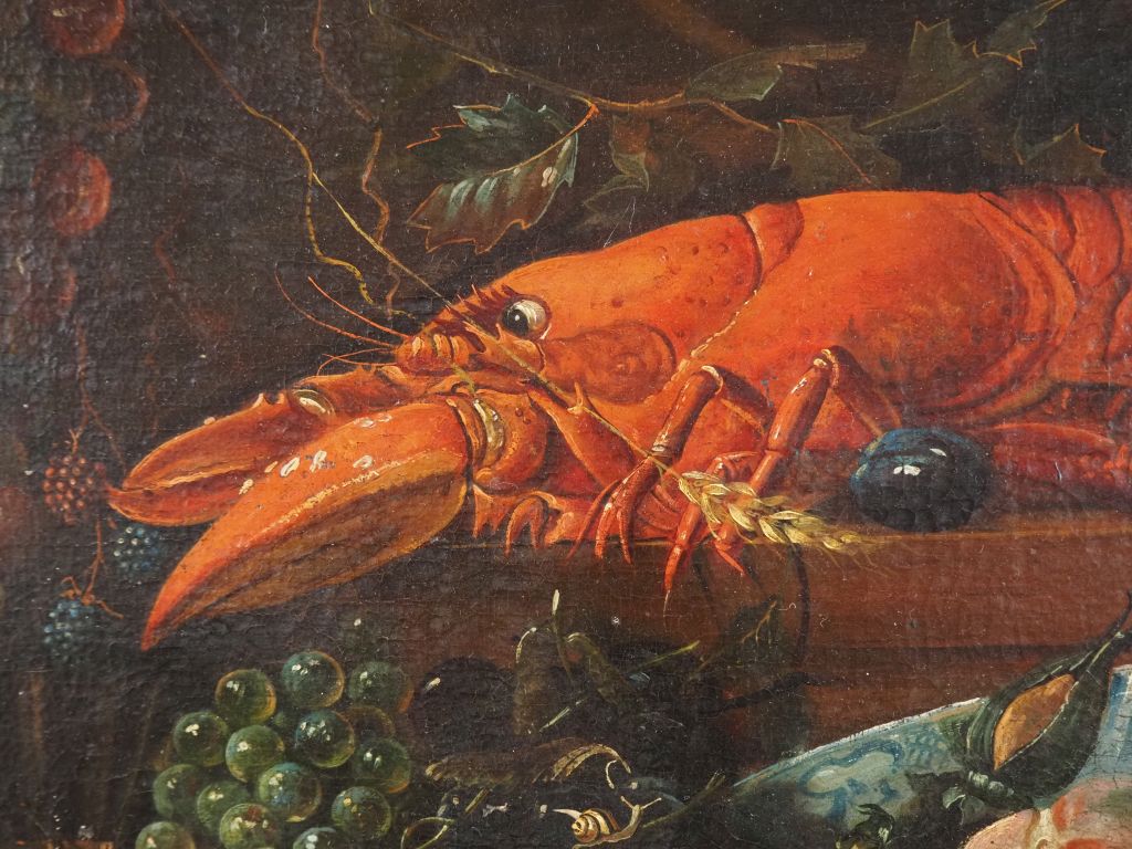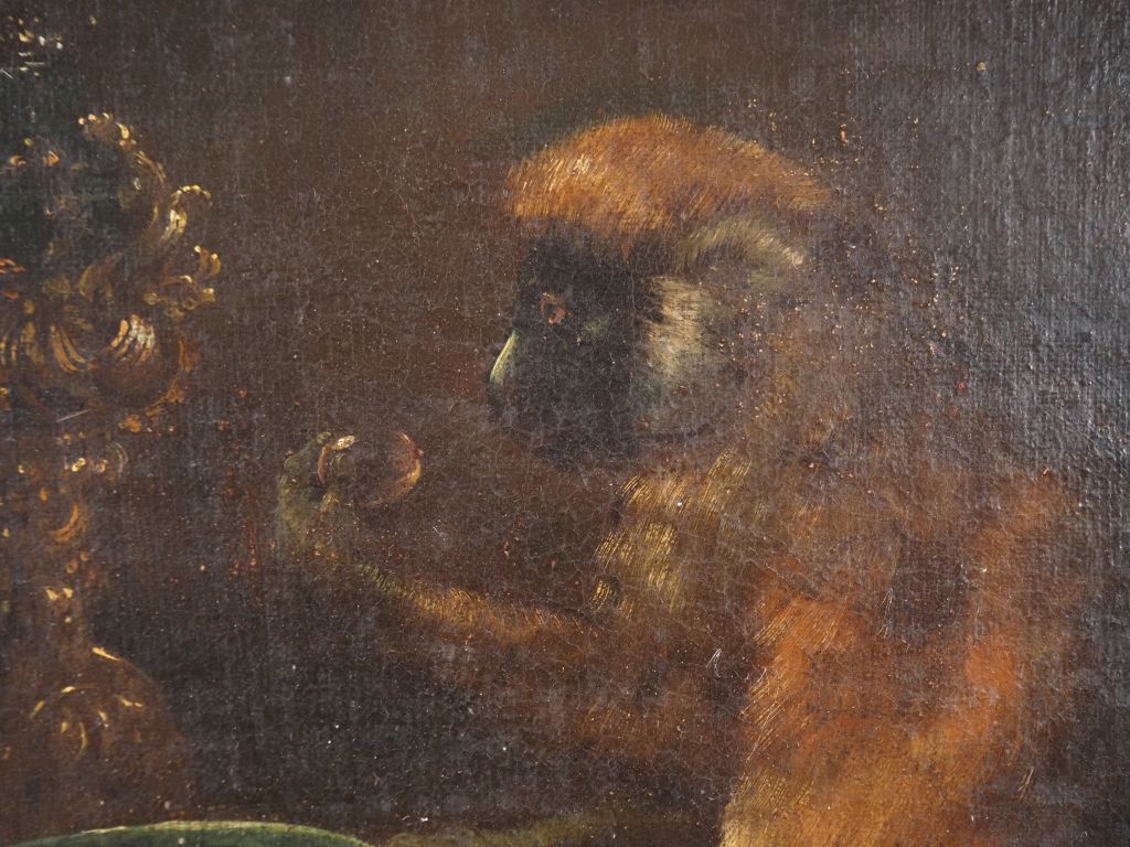 Paire d'Ecoles françaises dans le goût des Ecoles flamandes XVIIème. "Nature morte aux crustacés" et "nature morte au singe". Paire d'huiles sur toiles. Dim. 55 x 77 cm.