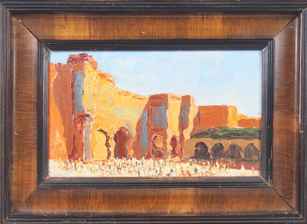 PROCHESKA. "Le souk en bas des remparts". Huile sur carton, signées en bas à droite. Dim. 14 x 18 cm.