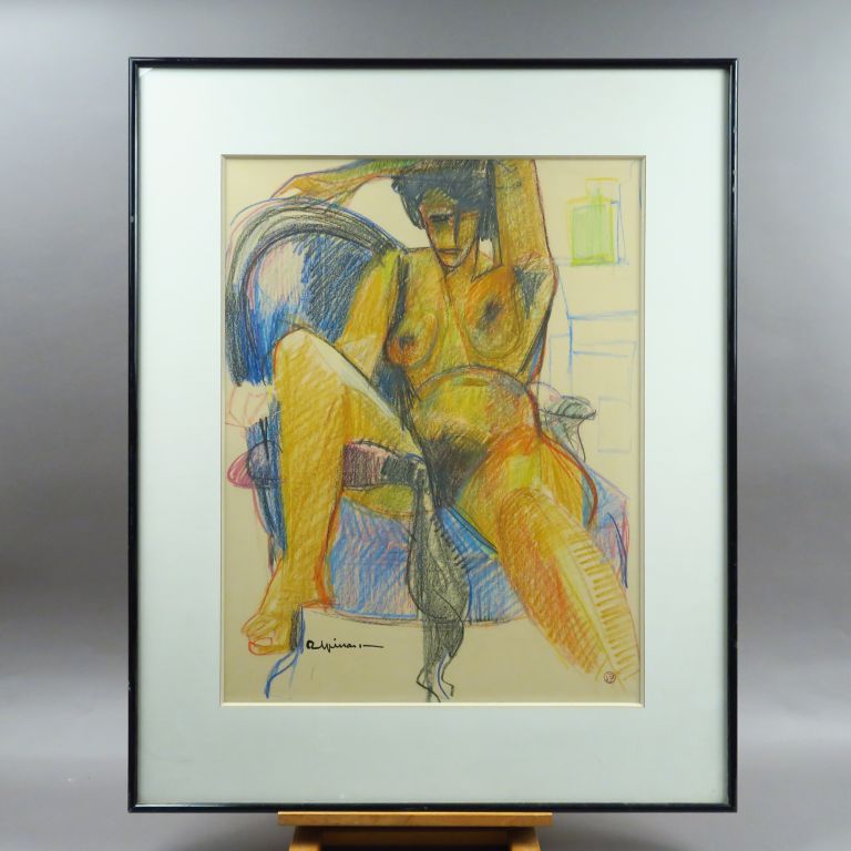 R. ESPINASSE. "Nu assis au fauteuil". Craies de couleurs à la cire, signée en bas à gauche et daté au dos 1963. Dim. 63 x 48 cm.