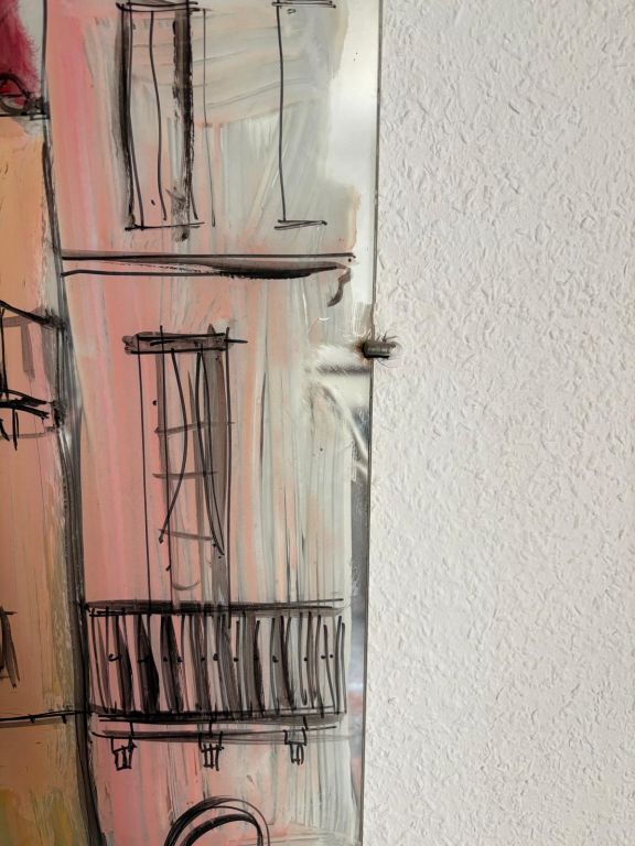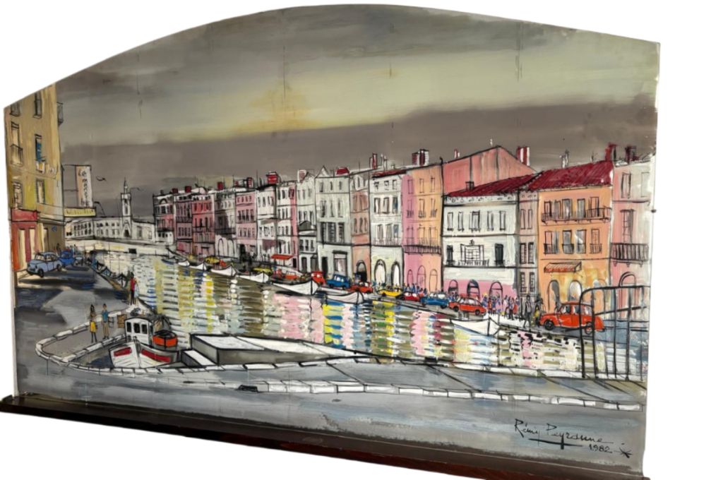 Rémy PEYRANNE. "le port de Sète" Peinture sur miroir, signée en bas à droite et datée 1982 Dim. 321 x 193 cm VENDUE SUR DESIGNATION (se trouvant au rez de chaussée d'une maison située à Sète)