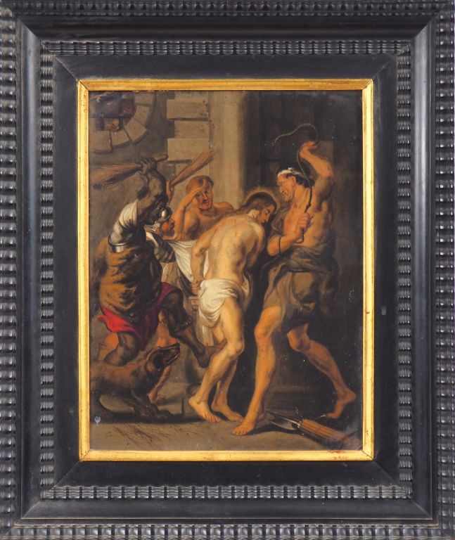 RUBENS (entourage de). "La flagellation du Christ". Huile sur cuivre. Dim. 30,5 x 23,5 cm. (Petite déformation en bas à droite).