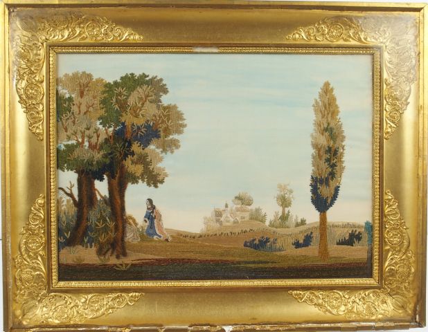 Soie brodée XIXe 'Personnage en prière dans un paysage'. 33 x 45 cm. D...