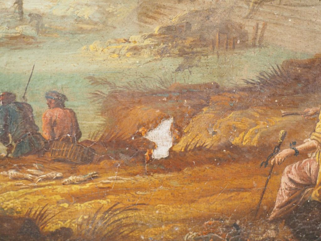 VAN DER SLUYS. "Port animé dans un paysage d'architecture". Huile sur toile signée. Dim. 46 x 55 (Sauts de peinture).