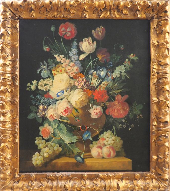 VAN SPAENDONCK (dans le gout de). "Nature morte aux fleurs et aux fruits". Huile sur toile. Dim. 75 x 63 cm.