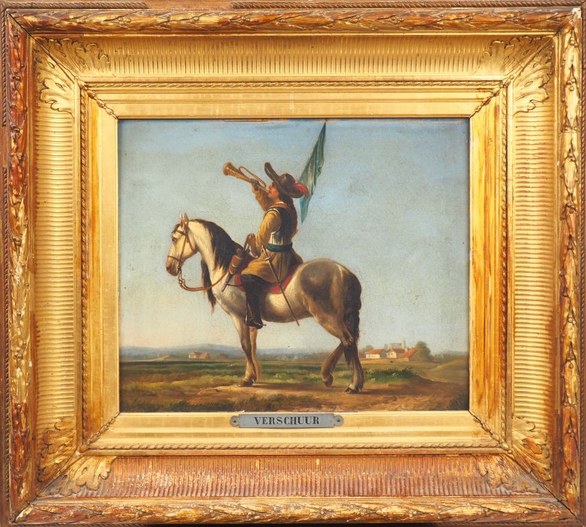 VERSCHUUR. "Le clairon". Huile sur papier. Dim. 33 x 39 cm.