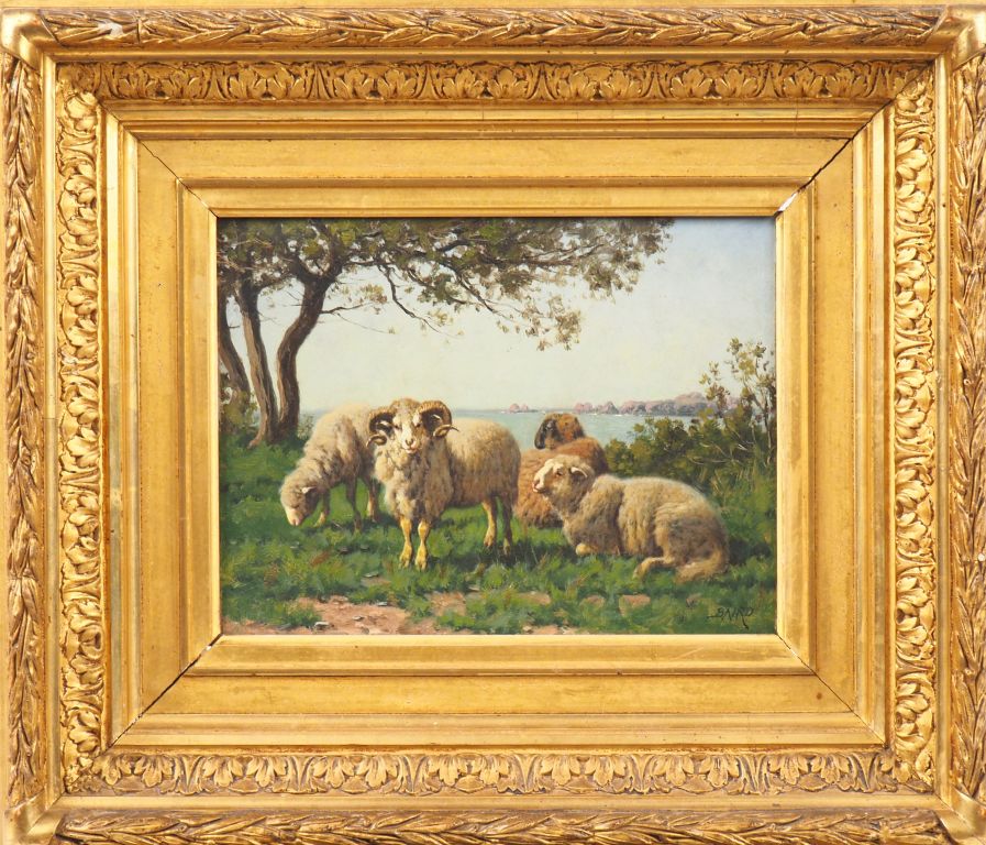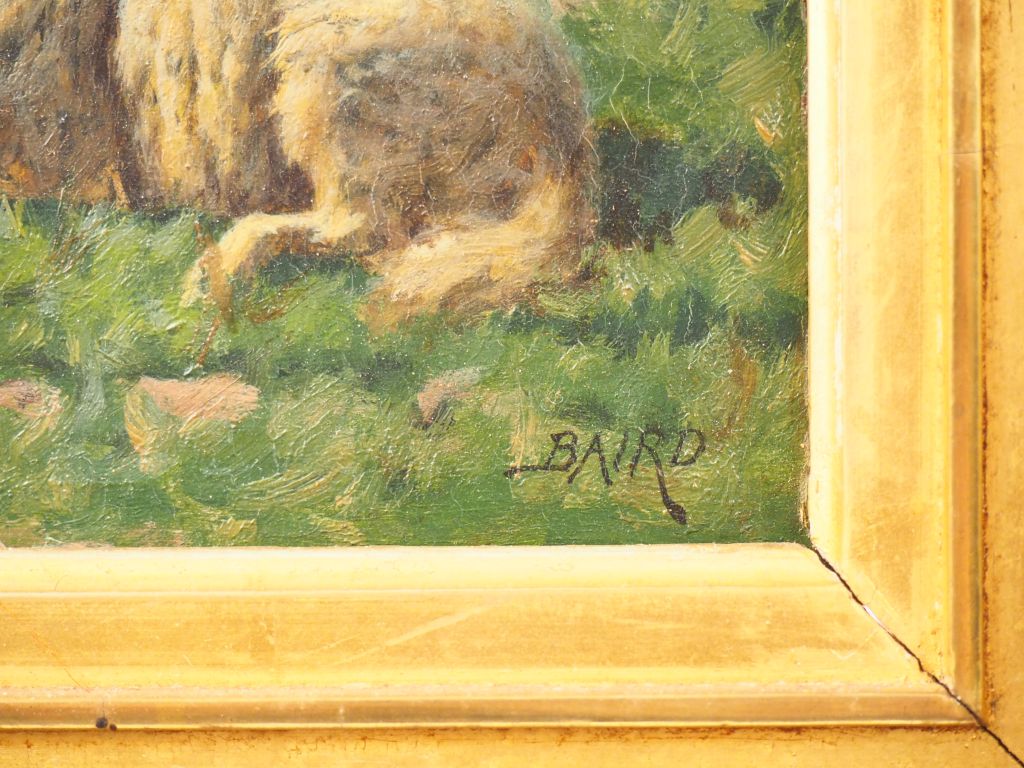 William Baptiste BAIRD. "Moutons et bêliers en bord de falaise". Huile sur panneau, signée en bas à droite. Dim. 16 x 22 cm.