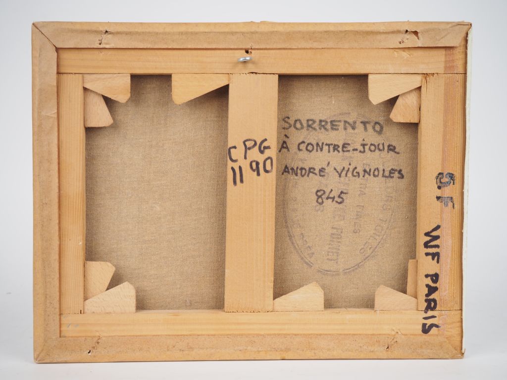 A. VIGNOLES. "Sorrento à contre jour" Huile sur toile, signée en bas à droite. Dim. 27,5 x 35 cim.
