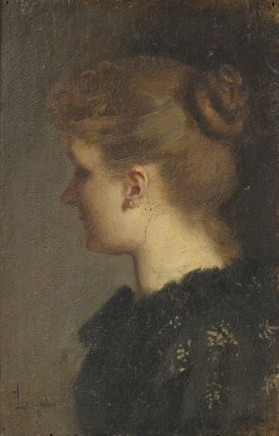 Ecole française XIXème 'portrait de jeune femme au chignon'. Huile sur panneau signée en bas à gauche. 23 x 16 cm.