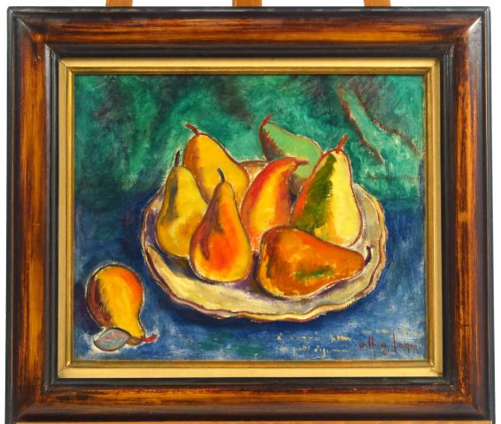 A. FAGES "Nature morte aux poires" Huile sur toile. Signée en bas à droite. 38,5 x 45,5 cm