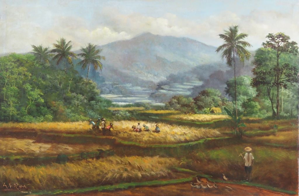 AA. RAKA. "Paysage de Madagascar au temps des moissons" Huile sur toile, signée en bas à gauche et datée 29 (?) Dim. 79,5 x 120 cm