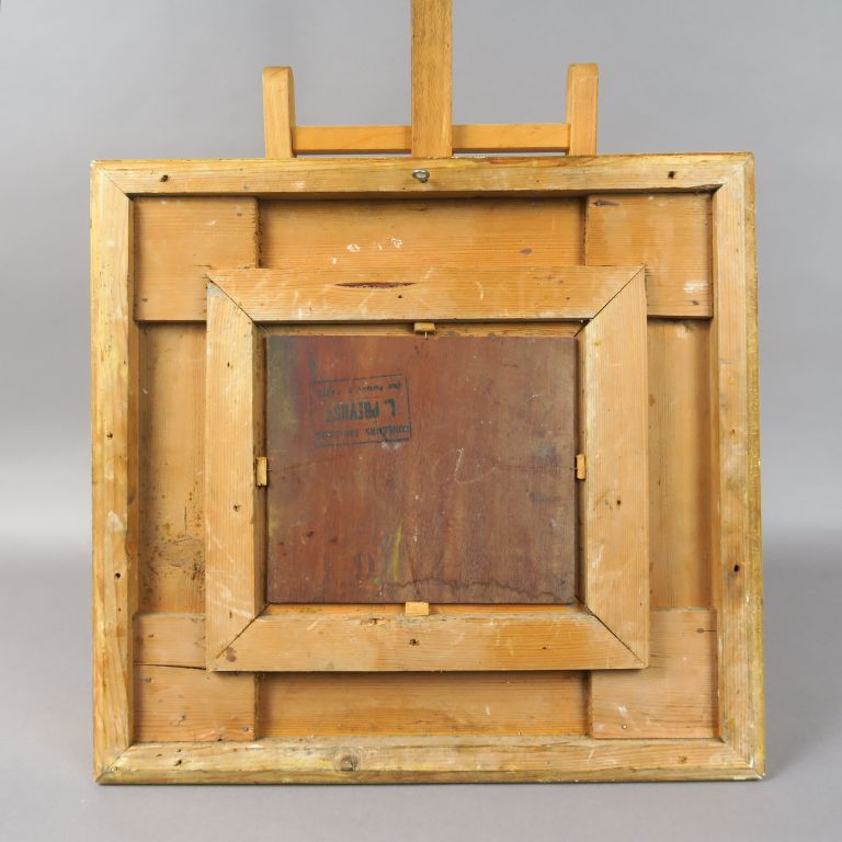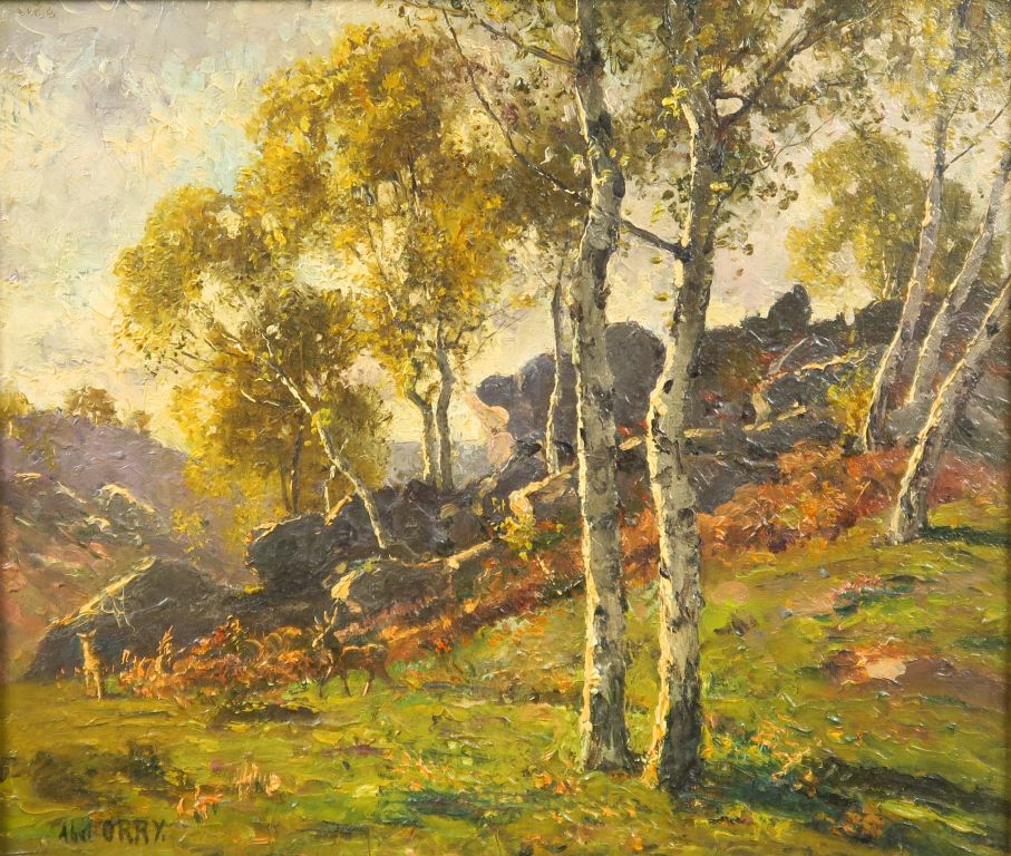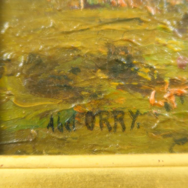 Abel ORRY "Paysage" Huile sur panneau. Signée en bas à gauche. Dans un cadre en bois et stuc doré (petits sauts). 19 x 22 cm