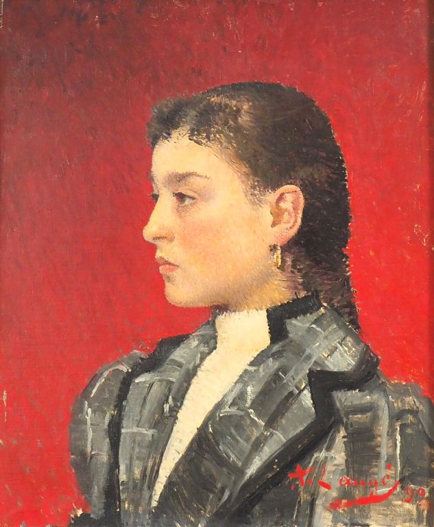 Achille LAUGÉ (1861-1944)/RC "Portrait de Jeanne Sarraut" Huile sur toile. Signée et datée 1890 Dim. 46 x 38 cm Un certificat de Madame Tamburini, spécialiste du peintre sera remis à l'acquéreur. Jeanne est la jeune soeur d'Albert Sarraut, (1872-1962), ami d’enfance de Laugé. Albert Sarraut sera vite l'une des principales figures du monde parlementaire de la IIIe République (député, sénateur radical socialiste de l 'Aude, Ministre et deux fois Président du Conseil). Au-delà de son talent politique, il fut critique d'art (préfacier d 'ouvrages sur Laugé), grand collectionneur (Cézanne, Pissarro, Dora, Gauguin, Bourdelle, Maillol, Henri Martin) et ami du marchand d'art Paul Guillaume. Laugé aura aussi exécuté un portrait d’Albert au pastel, conservé au Musée des Beaux-Arts de Carcassonne. Jeanne est ici représentée à l’âge de quatorze ans avec un profil presque parfait, sensible, ravissante et sérieuse comme tous les modèles du peintre. Le fond rouge éclatant est un héritage de la mode des portraits parisiens peints par Carolus Duran. Une succession de touches en hachures nerveuses et parallèles, gris-bleues, ocre-jaunes et rouges illuminent délicatement le visage, éclairé aussi plus classiquement par le chemisier blanc. On peut reprendre un commentaire de Nicole Tamburini, qui souligne la virtuosité du peintre dans le très intéressant catalogue de l 'exposition Achille Laugé, Portraits pointillistes, 1990 : « C'est par les effets d'ombres et les reflets de lumière, l'importance des méplats, l'exactitude des plans, la justesse des rapports que Laugé édifie l'architecture du massif facial, exactement comme il construit un paysage ». Experts : Frédérick et Pauline Chanoit