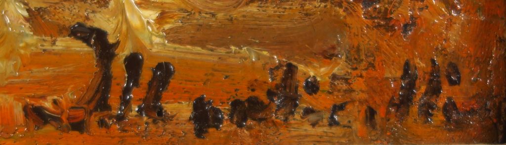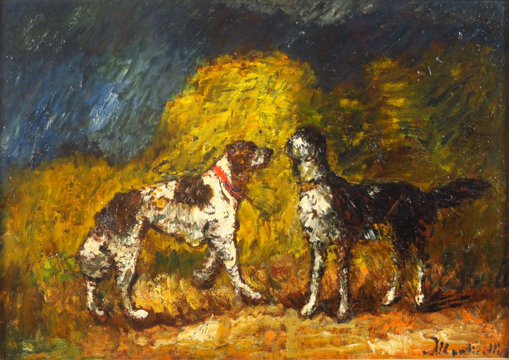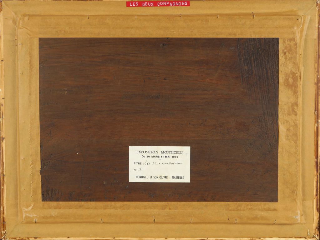 Adolphe MONTICELLI "Les deux compagnons" Huile sur panneau. Signée en bas à droite. Porte une étiquette d'exposition au dos : "Exposition Monticelli du 20 mars au 11 mai 1979 - Titre : Les deux compagnons - N° : 5 - Monticelli et son œuvre, Marseille" 35,5 x 48,5 cm