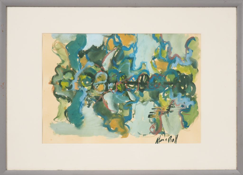 Alain ROTH. "Composition". Gouache sur papier, signée en bas à droite. Dim. (à vue) : 33 X 47 cm.