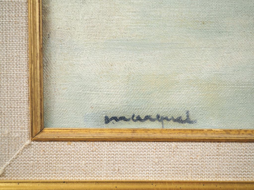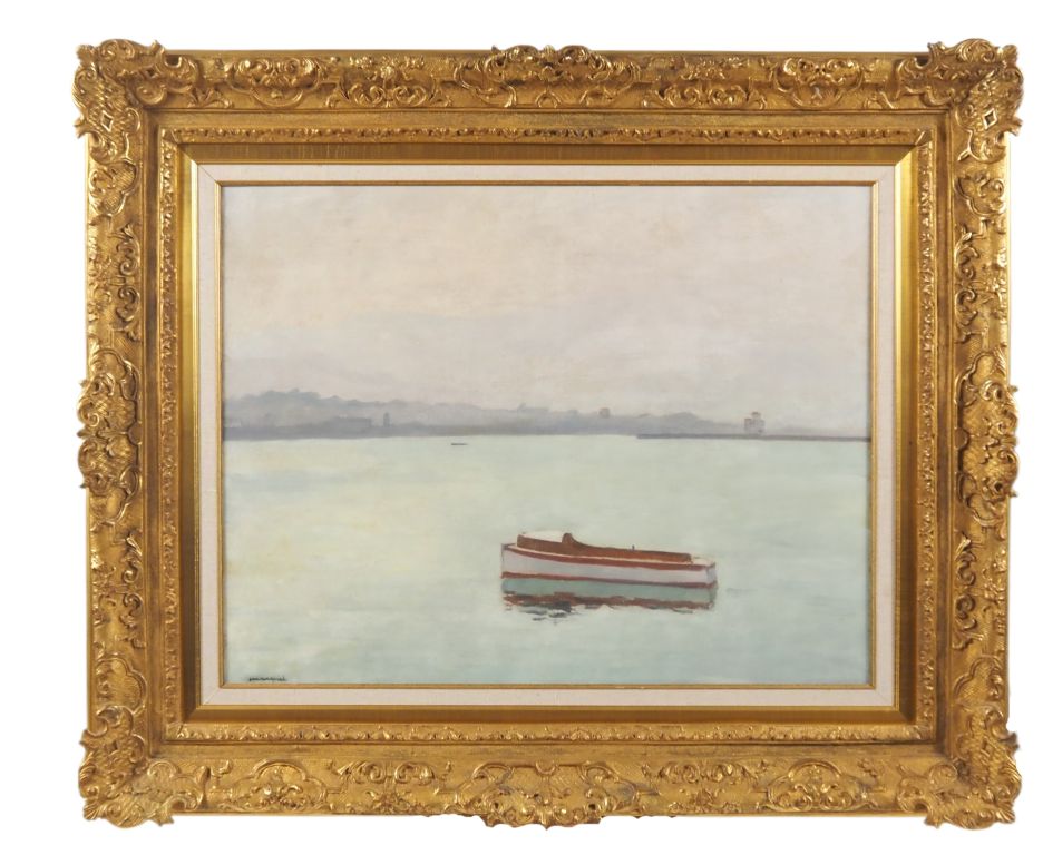 Albert MARQUET (1875-1947) « Canot sur la Bidassoa », Hendaye, 1926 Huile sur toile. Signée en bas à gauche Dim. 62 x 80 cm A l'été 1926, Albert Marquet est en villégiature à Hendaye avec son épouse Marcelle . Il place ici son chevalet sur la baie de Txingudi, estuaire de la Bidassoa. L 'artiste s’y montre fasciné par la brume caractéristique du pays basque, la boullarta qui enveloppe les montagnes et qui donne à la mer une couleur de jade. (Consulter pour Marquet et le pays basque le site //v-assets.cdnsw.com) Provenance : -Galerie Bernheim Jeune -Galerie Amaury Goyet -Collection particulière Madame DC (Montpellier) Ce tableau est accompagné de deux avis d'inclusion au Catalogue Raisonné en préparation de l'œuvre d'Albert MARQUET par Daniel Wildenstein et Jean-Claude Martinet en date du 22 avril 1997 et d'un second avis d'inclusion au catalogue de Guy Wildenstein et Jean-Claude Martinet en date du 30 avril 2004. Experts : Frédérick et Pauline Chanoit - 01 47 70 22 33
