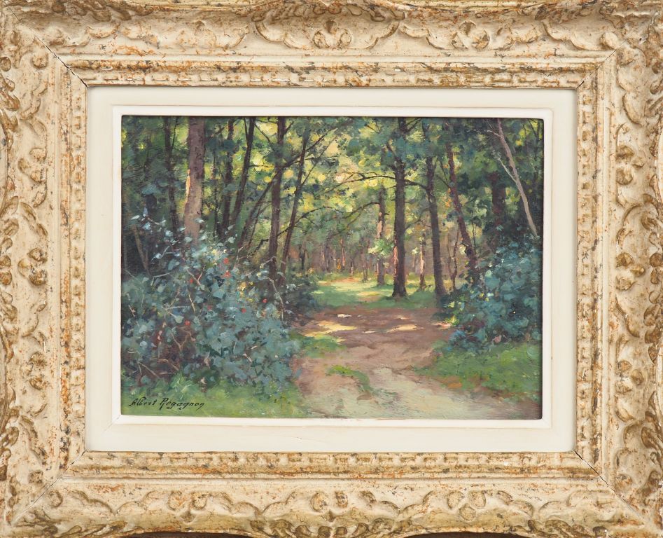 Albert REGAGNON. "Lisière de forêt en Ariège". Huile sur panneau, signée en bas à gauche et tirée au dos. Dim.24 x 33 cm.