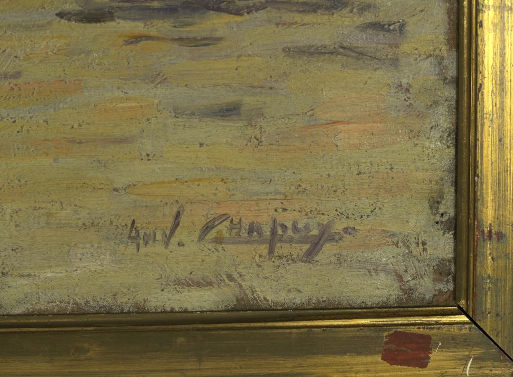 André CHAPUY. "Bords de fleuve" Huile sur toile, signée en bas à droite. Dim. 65 x 81 cm (état moyen)