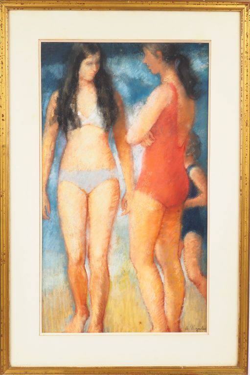 André VIGNOLES. "Baigneuses". Pastel signé en bas à droite. Dim. à vue : 69,5 x 39,5 cm.