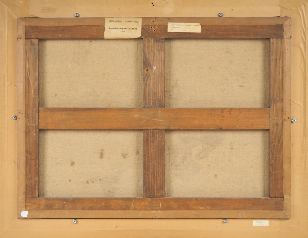 Auguste CHABAUD (1882-1955) « Femme en bleu au comptoir », 1909 Huile sur carton marouflé sur toile. Signée en bas au centre. (restauration) Dim. 58 x 79 cm Bibliographie : Auguste Chabaud, par Maximilien Gauthier, Editions Les Gémeaux, Paris, 1952, illustré sous le n° 9. Exposition : -Paris, Cercle Artistique et Littéraire de Volney, « 50 ans de peinture » juin-juillet 1952, n° 38. (Etiquette au dos) -Nîmes, Exposition rétrospective A.Chabaud, juillet-septembre 1956 -Musée des Beaux-Arts de Metz, 1958. -Musée des Beaux-Arts de Nancy, 1958. -Musée Toulouse Lautrec d’Albi, « Chabaud, Seyssaud et Verdilhan », 1959, n°7. (Etiquette au dos) -Galerie Tony Spinazzola, Aix-en-Provence,1960. -Musée Asashi Shimbum, Japon, « Les Fauves », 1965. -Musée Kanazawa et Musée Ishikawa, Tokyo, Japon, « Les Fauves au Japon » ,1974. -Musée des Beaux-Arts d’Hiroshima et Musée Otani des Beaux-Arts, Nishinomiya et Musée de Tukushima, Japon « Matisse et ses amis » du 10 avril au 5 mai, 1981 Provenance : Collection particulière Monsieur R (Toulouse) Après son service militaire effectué en Tunisie (1903-1906), le peintre provençal Auguste Chabaud, paysan agriculteur à Graveson, monte à Paris, s'installe à Montmartre et fréquente bientôt l'avant-garde picturale parisienne, notamment celle qui vit au Bateau-lavoir (Picasso et Van Dongen). C'est ce dernier qui a exposé avec les fauves au Salon d'automne qui marque fortement le peintre provençal ( vie sociale parisienne, vivacité des couleurs, dessin agressif cernés de lourds traits noirs). Chabaud expose aux Indépendants et au Salon d'automne. Il peint des tableaux qui illustrent sa fascination pour la vie mondaine, les soupers fins, les cafés élégants, les palaces mais aussi pour la nuit parisienne, ses maisons-closes et les filles de mauvaise vie . Notre Tableau est un chef-d'œuvre de 1909 du fauvisme de Chabaud : couleurs très hautes, dessin anguleux et agressif, perspective heurtée, contraste de noirs et de blancs très lumineux. Experts : Frédérick et Pauline Chanoit - 01 47 70 22 33
