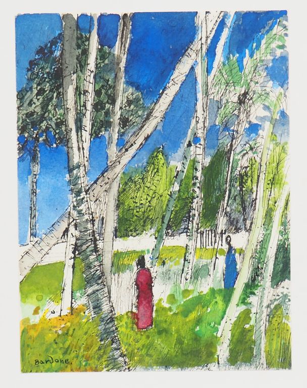 BARDONE "Femme dans la clairière à Ceylan" Aquarelle signée en bas à gauche Dim.19 x 14,5 cm