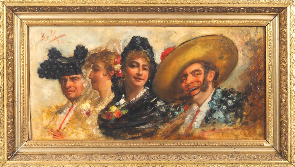 BELLI. "Etude de personnages espagnols" Huile sur toile, signée en haut à gauche et datée 94 Dim. 33 x 65,5 cm
