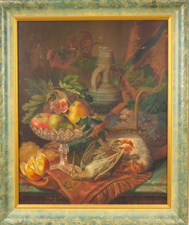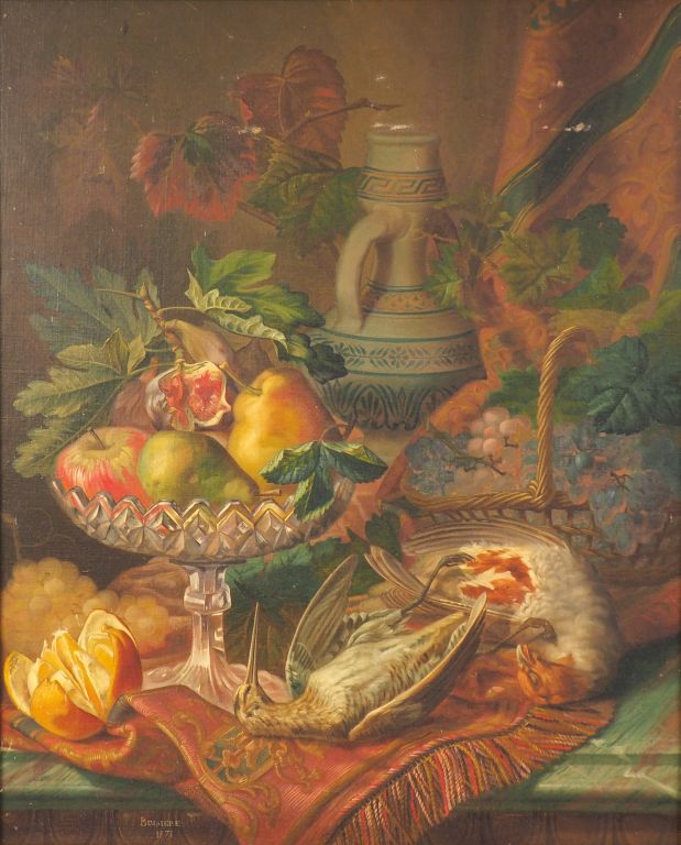 BUSSIERE. "Nature morte aux fruits et au gibier". Huile sur toile signée et datée 1871 en bas à gauche. Dim. 74 x 59,5 cm.
