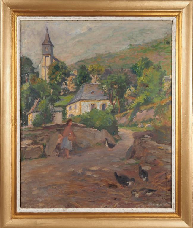 C. BERGES. "Jeune fermière nourrissant ses canards" Huile sur toile, signée en bas à droite Dim. 65 x 52,5 cm