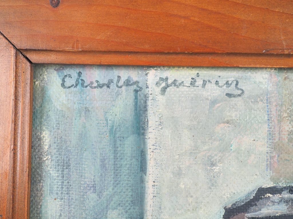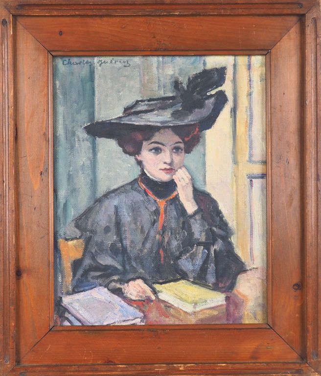 Charles GUERIN "Elégante au chapeau et aux livres" Huile sur toile. Signée en haut à gauche. 41 x 33 cm