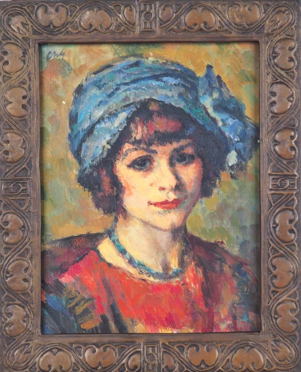 Charles GUERIN "Jeune femme au chapeau bleu" Huile sur toile. Monogrammée en haut à gauche. 36 x 27 cm