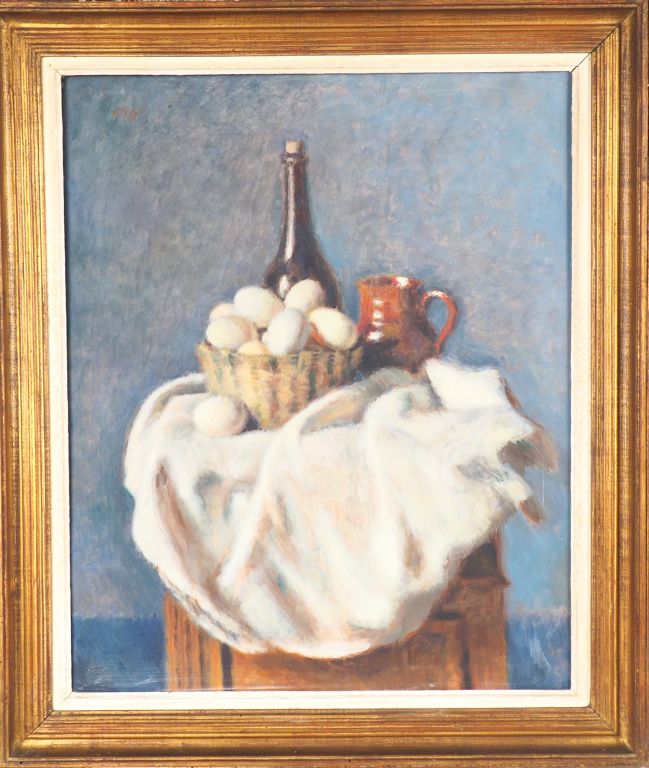 Charles GUERIN "Nature morte aux œufs, au pichet et à la bouteille" Huile sur toile. Monogrammée en haut à gauche. 73 x 60 cm
