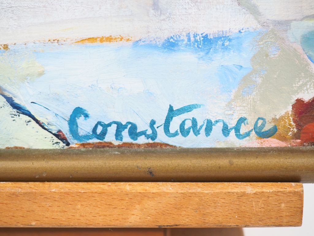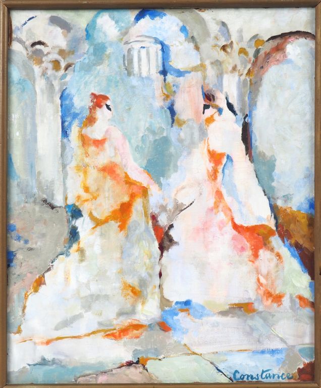 CONSTANCE NIELSEN "Le bal masqué". Huile sur toile signée en bas à droite. Dim., 47 x 38 cm.