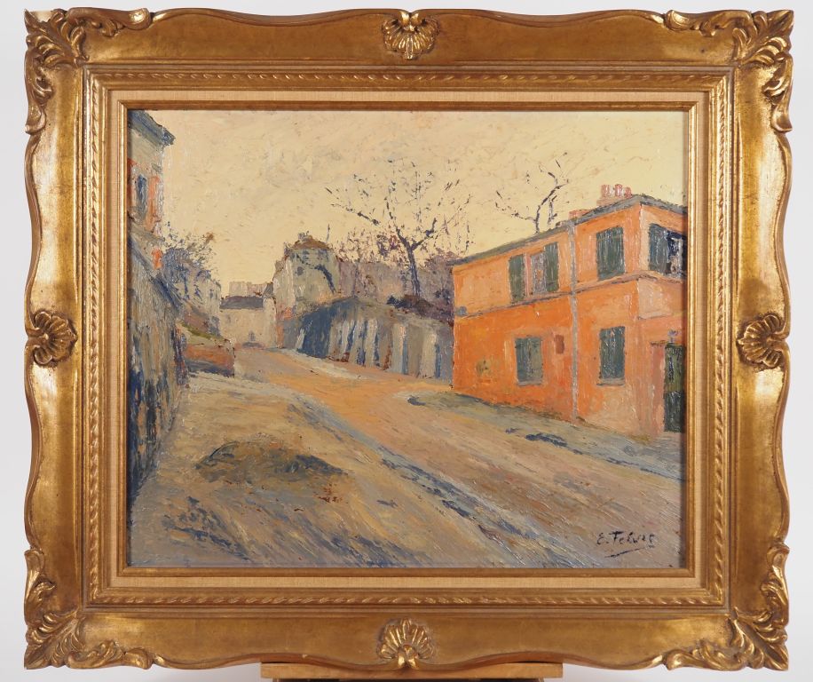 E. FEBVRE. "le vieux Montmartre, la rue des saules, coin de la maison rose" Huile sur panneau, signée en bas à droite Dim. 50 x 61 cm