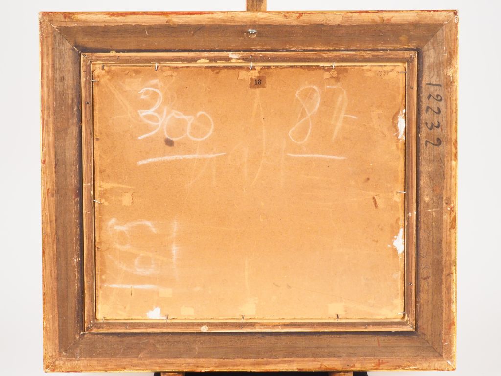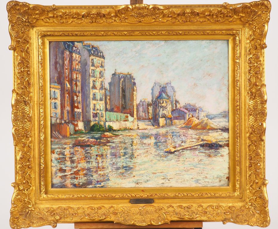 E. MEYER. "Bord de fleuve". Huile sur carton, signée et datée 1922 en bas à droite, dans un cadre en bois et stuc doré. Dim. 37,5 x 46 cm.