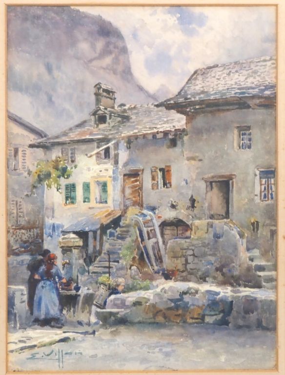 E. VILLAIN. "A la fontaine du village" Aquarelle, signée en bas à gauche Dim. 37 x 27,5 cm