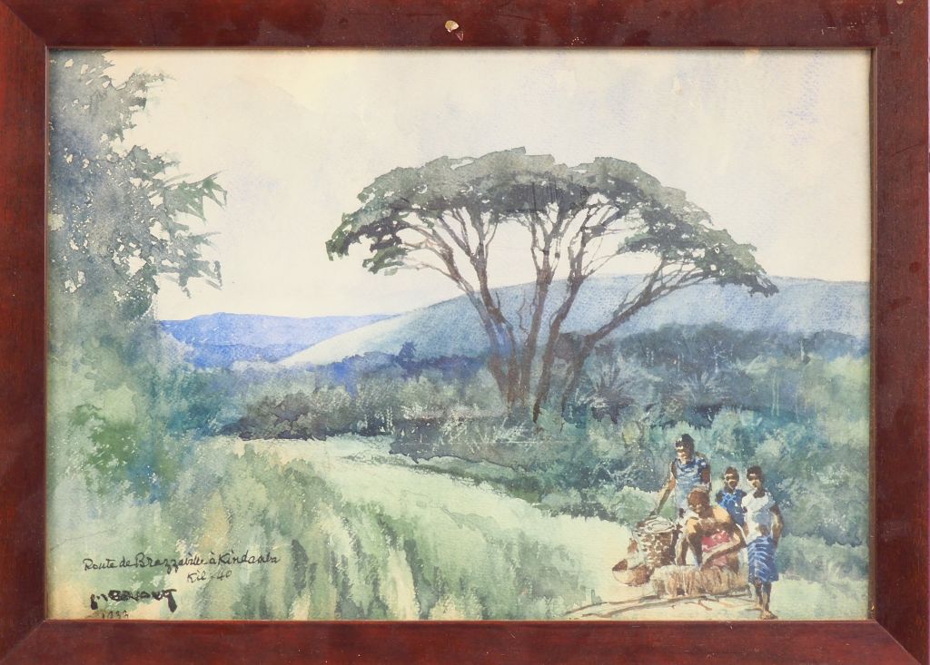 Ecole africaniste XXème. "Route de Brazzaville". Aquarelle signée en bas à gauche et datée 1933. Dim. (à vue) : 26,5 x 38,5 cm.