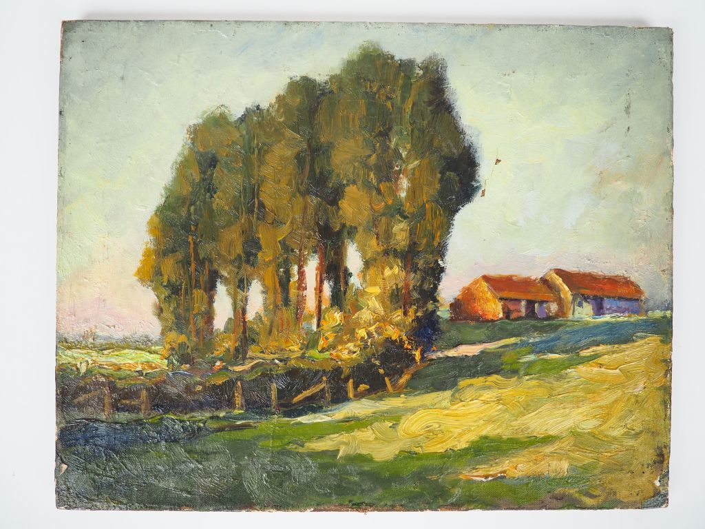 Ecole française début XXème. "la Ferme près des peupliers". Huile sur toile. Dim. 33 x 42 cm.