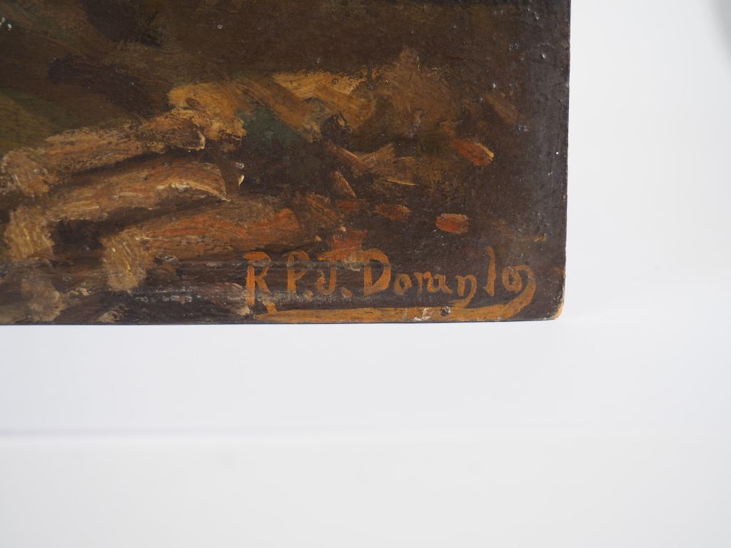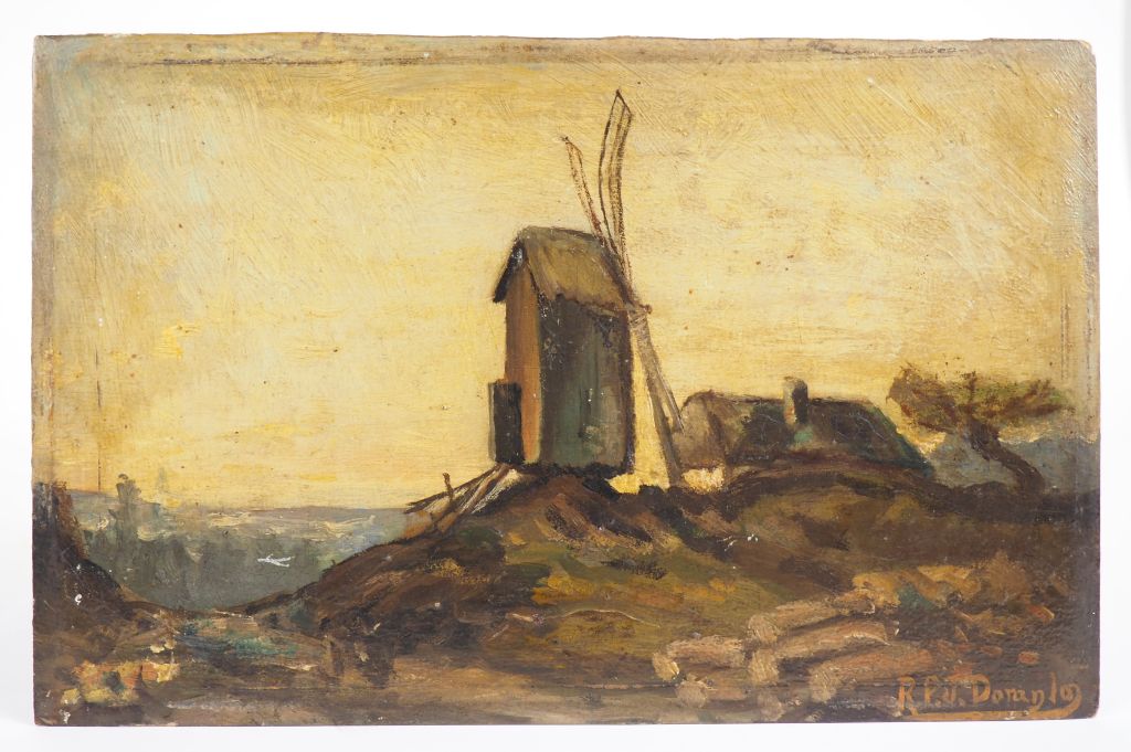 Ecole française fin XIXème - début XXème. "Le moulin" et "marine". 2 huiles sur carton, signées en bas à droite. Dim. 16 x 22 cm. Dim. 16 x 24 cm.