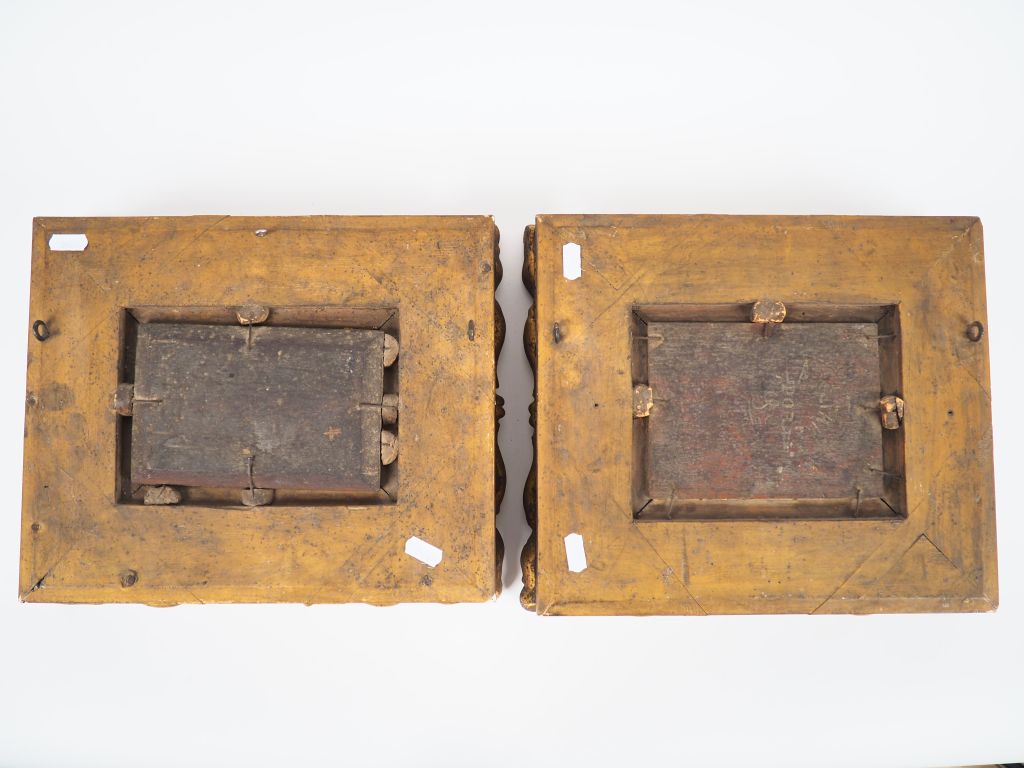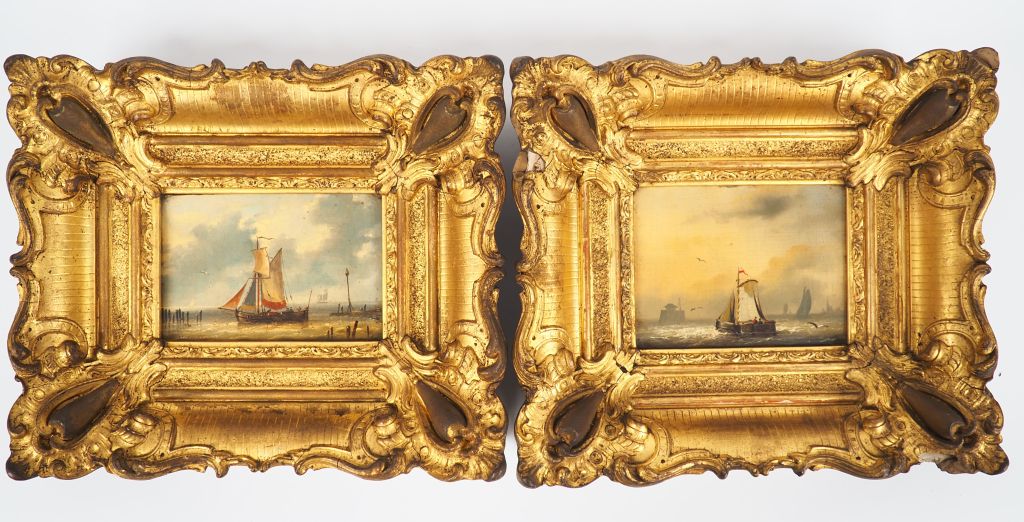 Ecole française fin XIXème début XXème. "Marine". Paire d'huiles sur panneaux, dans des cadres en bois et stuc doré de style Louis XV (une signée). Dim. 11 x 17 cm. (Petit accident à l'un des cadre)
