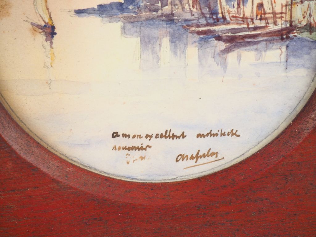 Ecole française fin XIXème début XXème. "Paysages de bord de mer dans le Midi". 5 aquarelles dans un même encadrement signées en bas à droite (illisible). Diam. 9 cm