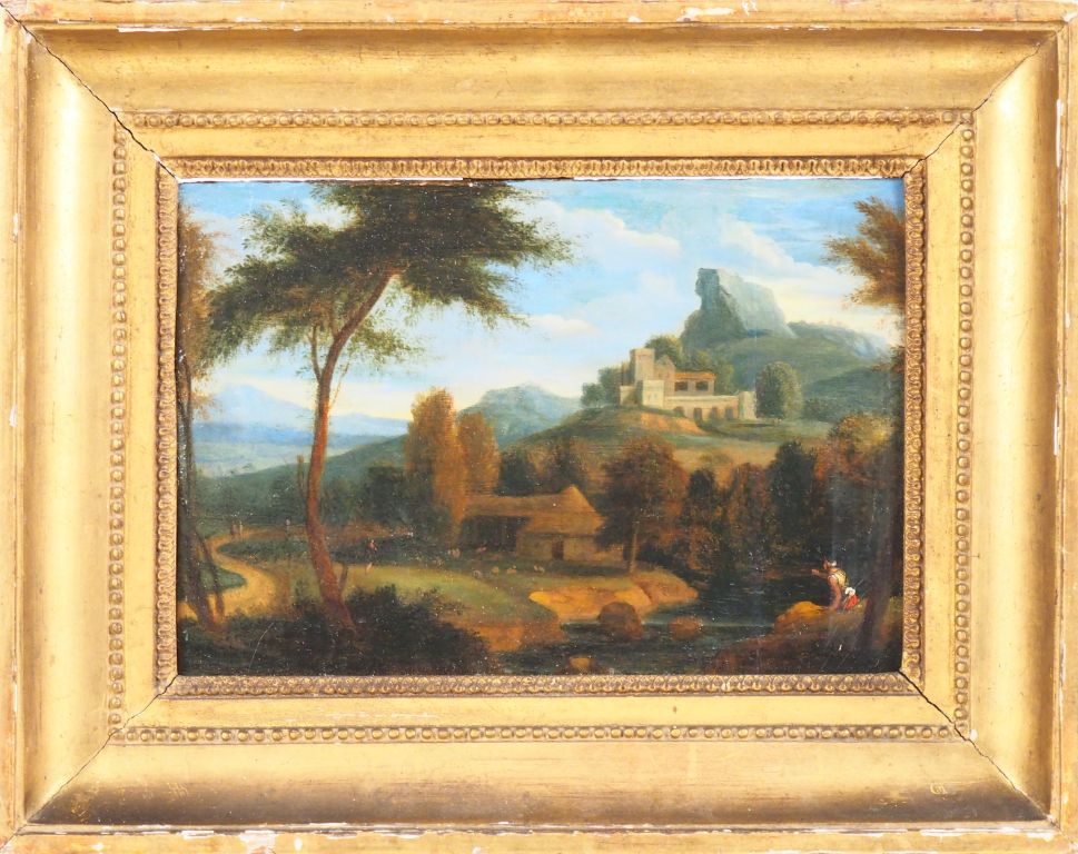 Ecole française ou italienne XIXème. "Paysage animé". Huile sur panneau. Dim. 15,5 x 22 cm.