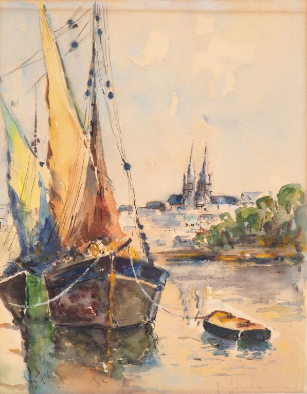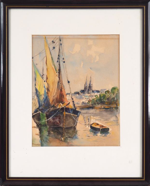 Lot de Ecole française XXème "Bateau à quai" Aquarelle. Signée en bas à droit au prix de 40 à 60 € en vente aux enchères par l'hôtel des ventes Primardeco