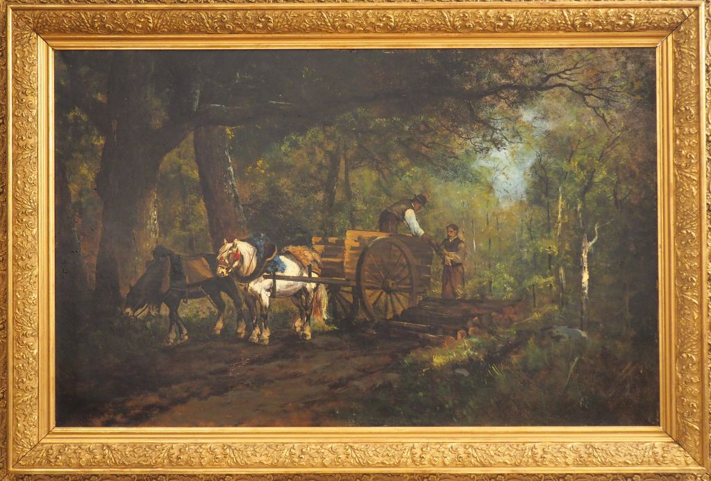 Ecole française XXème. "le chargement de bois". Huile sur toile. Dim. 73 x 116 cm. (restaurations).