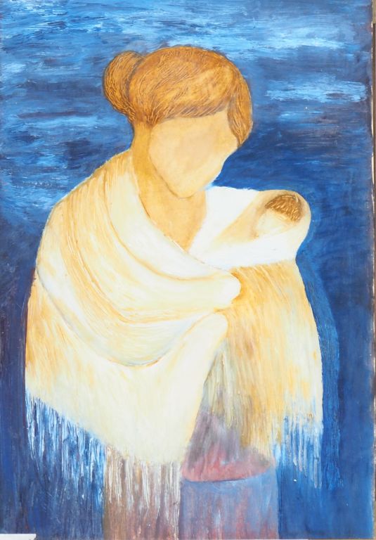 Ecole française XXème. "Maternité". Gouache sur papier. Dim. 29,5 x 20,5 cm.